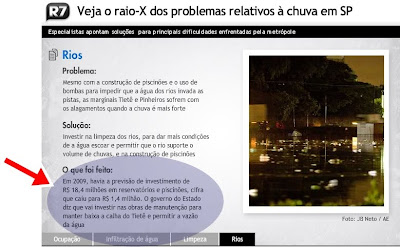 Para os cinco especialistas (atuantes nas áreas de geologia, engenharia, urbanismo, meteorologia e administração pública), existem vários fatores que concorrem para o estado de calamidade por que passa a região metropolitana de São Paulo. Dentre as causas apontadas, há desde a desordenada ocupação de determinadas áreas e ausência de mais investimentos em limpeza até a falta de melhoria no tratamento de córregos e rios. No item investimento em reservatórios e piscinões, chega a ser assombrosa a redução de R$ 18,4 milhões para a mísera cifra de R$ 1,4 milhão (confira imagem acima)! Ao que parece, não existe compromisso com o povo da cidade de São Paulo e regiões circunvizinhas, nem visão estruturadora que venha a minimizar os estragos causados pelas chuvas. Este é o jeito SERRA/KASSAB de governar!