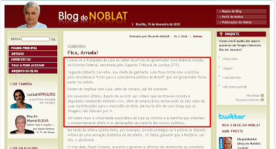 A sanha de atacar o presidente Lula e seu bem-sucedido governo parece estar infestando a alma jornalística do sr. Ricardo Noblat. Como se já não bastassem as famosas "barrigas" geradas, ele insiste em pontuar toda e qualquer discussão incrementando-a com referência danosa ou recheada de ironias a Lula e à Dilma Rousseff. Ficou provado o que LULA, de fato, quis dizer quando soube da prisão do governador-presidiário José Roberto Arruda. Ficou provado, também, o que LULA, de fato, quis dizer sobre as imagens em que o Arruda aparece em situação "vexatória", recebendo dinheiro. Todos já sabem, inclusive, o portal G1. Todos já sabem... Apenas o Noblat, não... Perdera ele a capacidade de discernir o que é verdade factual e o que é mentira plantada? Interessante é que o jornalista "barrigueiro" não tem tempo de curtir sua plantação, pois esta é logo devastada e arrancada por blogs e pelo próprio dono das terras em que trabalha, o G1.